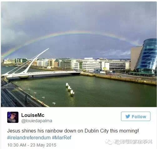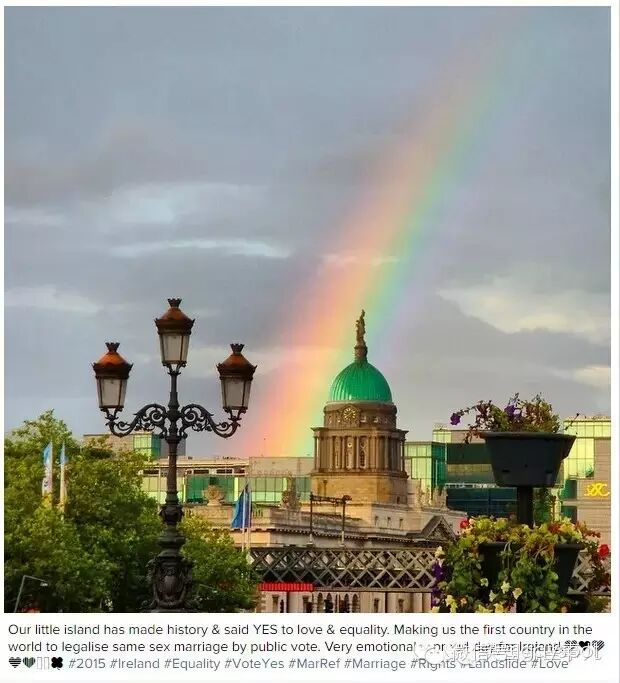 而且,就在今天,公投剛剛通過沒多久,整個愛爾蘭首都都柏林上空一連刷出 N 條彩虹!